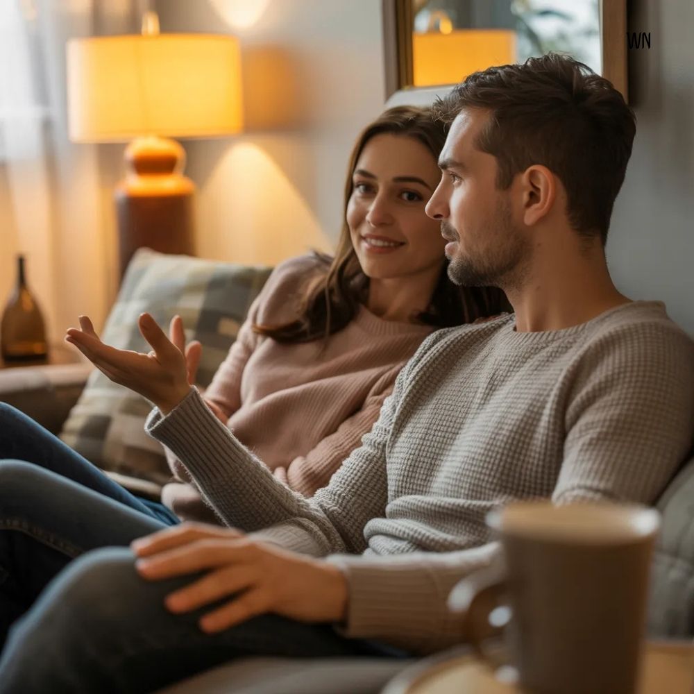 Both partners are sitting quietly on the couch at 9pm. One says, “I know today was draining, but I appreciate you being here with me.” No follow-up needed.